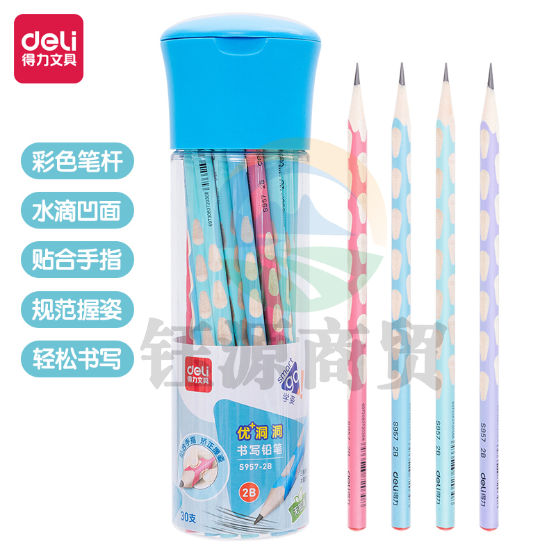 得力S957-2B_淡彩30支桶装2B优+洞洞书写铅笔(混)(30支/桶)