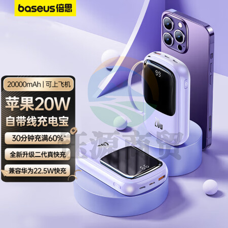 倍思 Q电充电宝 自带线20000毫安时 支持苹果20WPD快充小巧便携移动电源 数显适用iPhone14/13ProMax/12/XR 紫