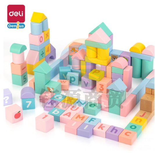 得力(deli)74524儿童100粒马卡龙色系木制积木玩具 男女孩大颗粒桶装积木玩具