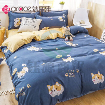 洁丽雅(grace)床上四件套被套床单被子四季通用单人宿舍床三四件套网红款 淘气猫-蓝 2.2米床【1床单+1被套+2枕套】