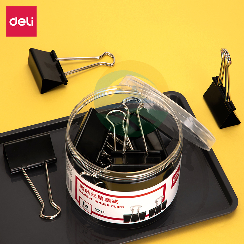 得力8561-1#黑色长尾票夹50mm(筒装)(黑)(12只/筒)