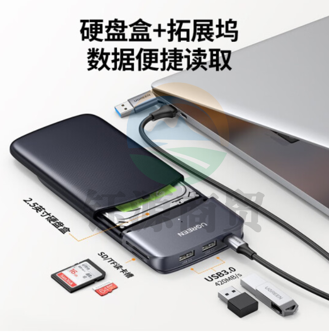 绿联(UGREEN) 60620 Type-C移动硬盘盒扩展坞M.2拓展坞2.5英寸SATA固态协议USB-C转接头HUB分线器SD/TF读卡