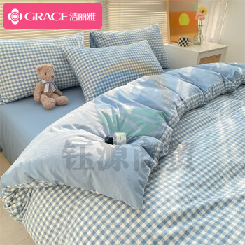 洁丽雅纯棉四件套100%全棉被套床单枕套床上用品套件 蓝小格1.5/1.8米床