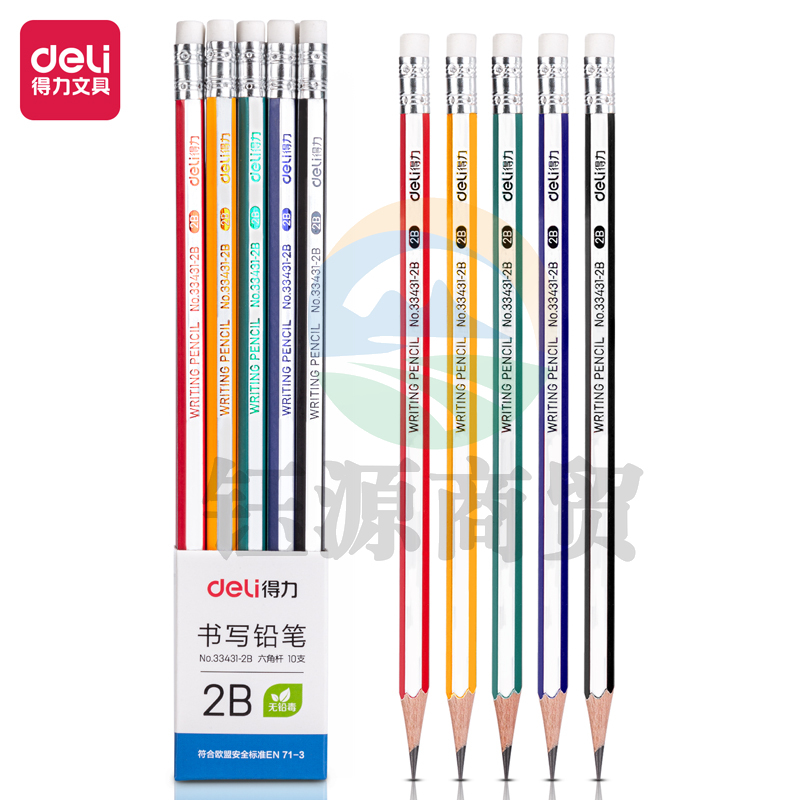 得力33431-2B_皮头抽条10支装六角杆2B铅笔(混)(10支/盒)