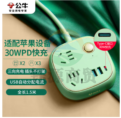 公牛(BULL)30W PD快充插座/插线板/插排/排插/拖线板 复古插座 3usb接口+2位五孔 全长1.5米 GN-R602U30