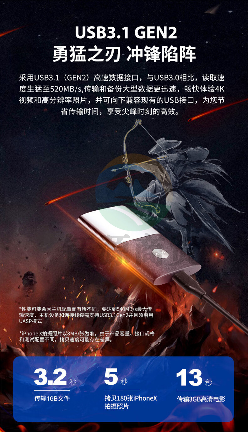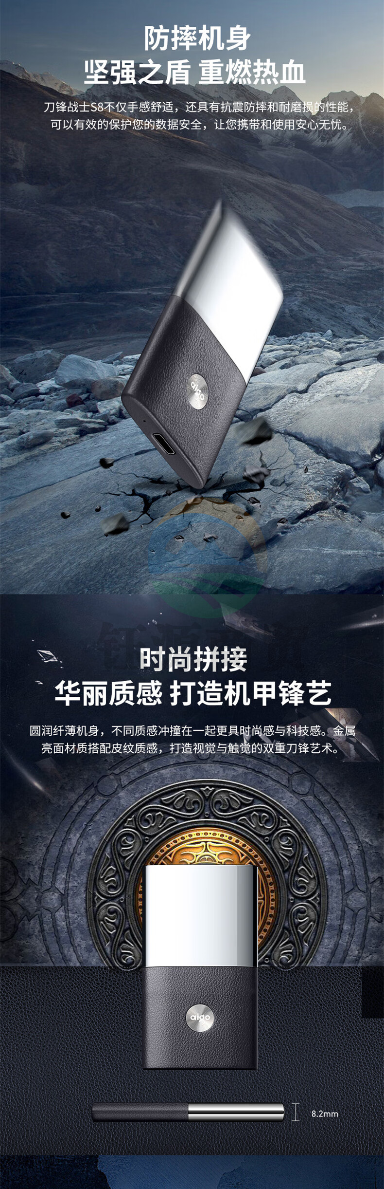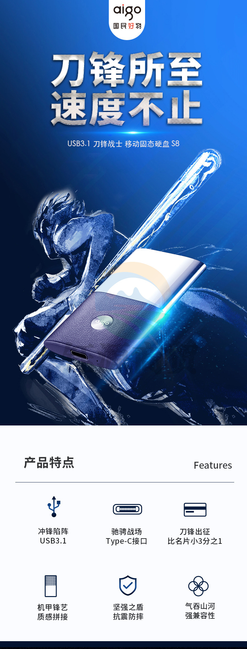 爱国者(aigo)1TB USB 3.1 移动硬盘 固态(PSSD) S8 刀锋战士 抗震防摔 读速高达520MB/s(一年包换)
