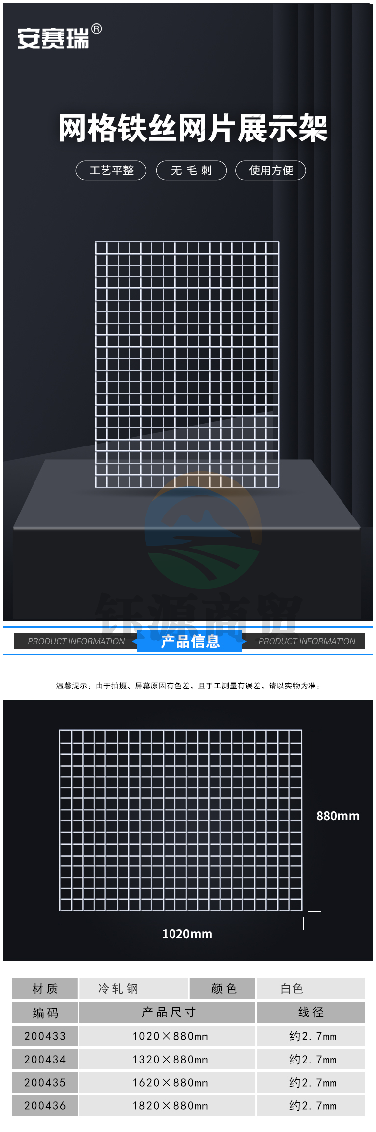 安赛瑞 网格网片货架 铁丝网片挂钩展示架 132*88cm 白色