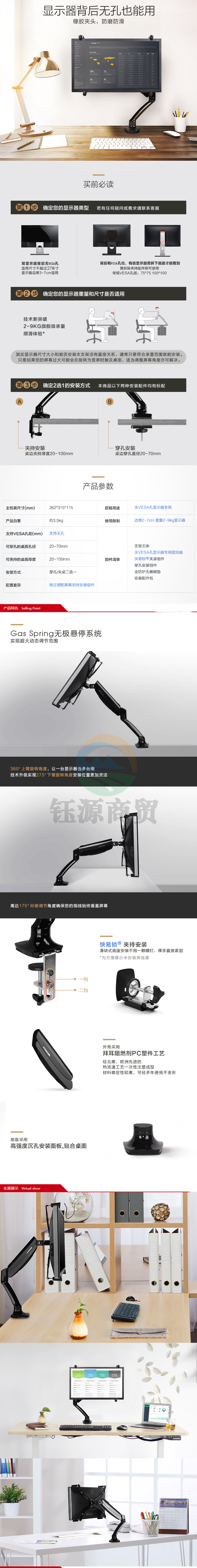 乐歌 无孔显示器支架 桌面旋转升降液晶电脑显示器支架臂 19-27英寸 WLSZ08281213145763