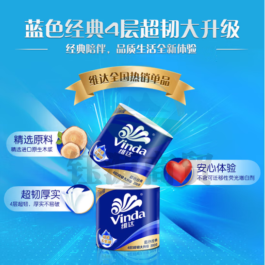 维达 (Vinda)蓝色经典卷纸4层200克10卷 有芯卷筒纸巾厕纸卫生纸手纸 蓝色(10卷/提)