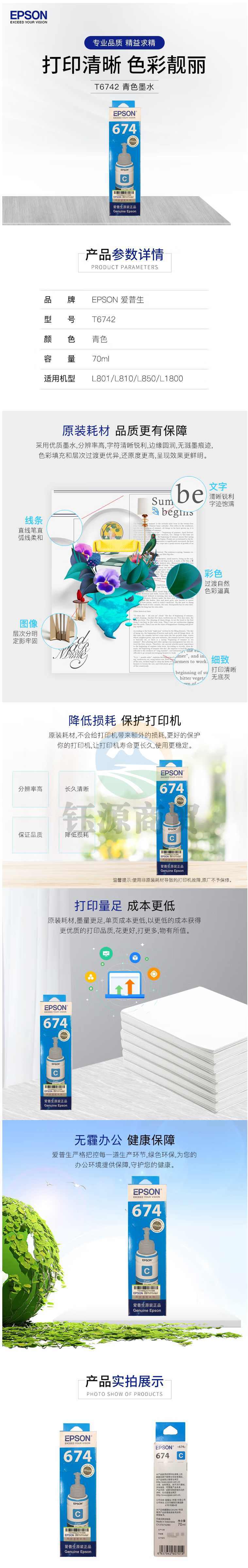 爱普生(EPSON)T6742 墨仓打印机墨水 青色(适用L801/L805/L810/L850/L1800/6745)