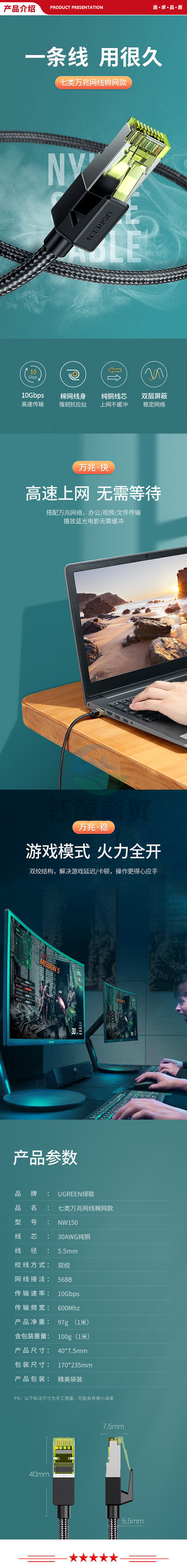 绿联 UGREEN NW150 七类网线 Cat7万兆棉网款网络连接线 工程家用8芯屏蔽纯铜双绞线 20米