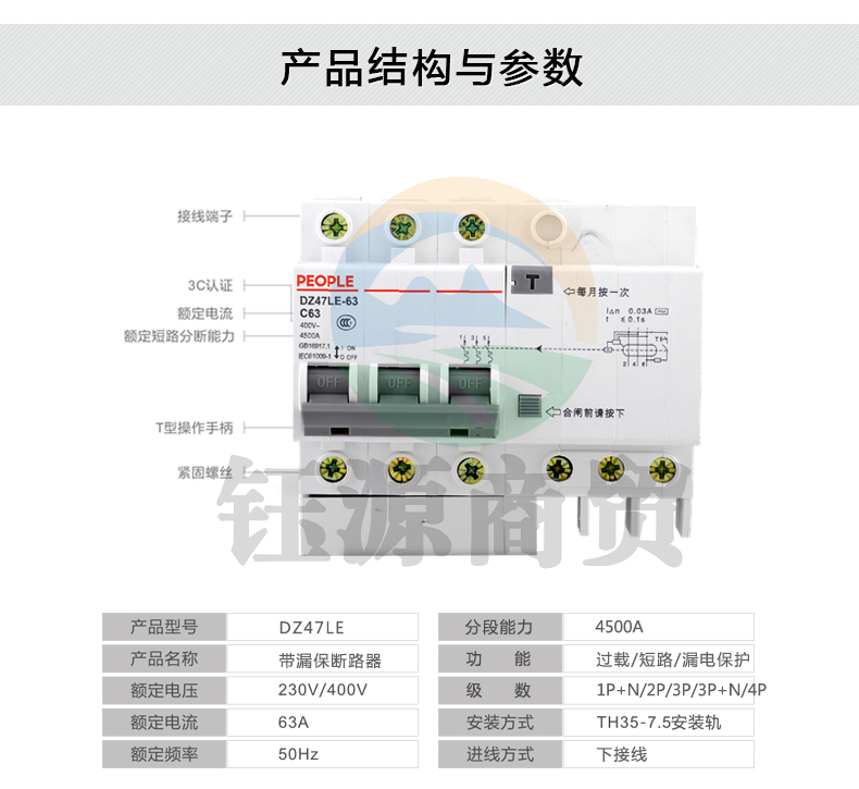 人民电器 DZ47LE 3P-63A小型漏电断路器