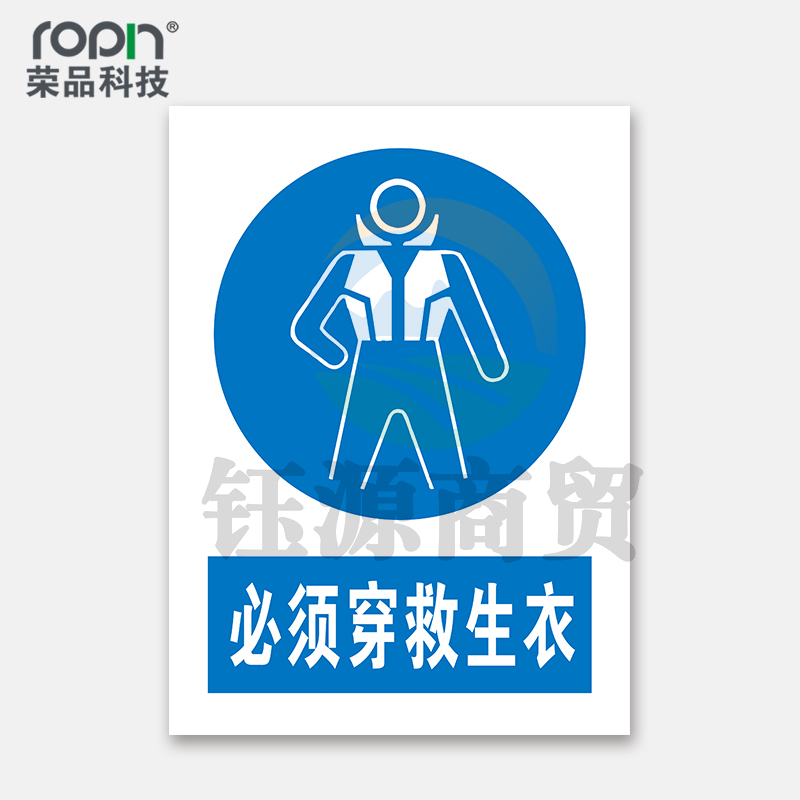 荣品 PVC国标安全警示标识牌验厂安检检查警示牌温馨提示定制订做自带背胶 必须穿救生衣 300×390mm