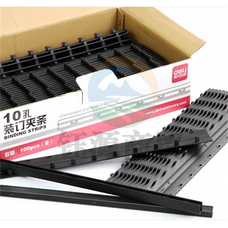 得力3828 10孔装订夹条A4塑料十孔标书文件装订机夹边条 100支/盒 黑色 12.5mm 可装订125页左右