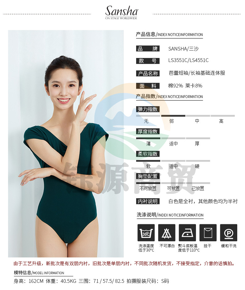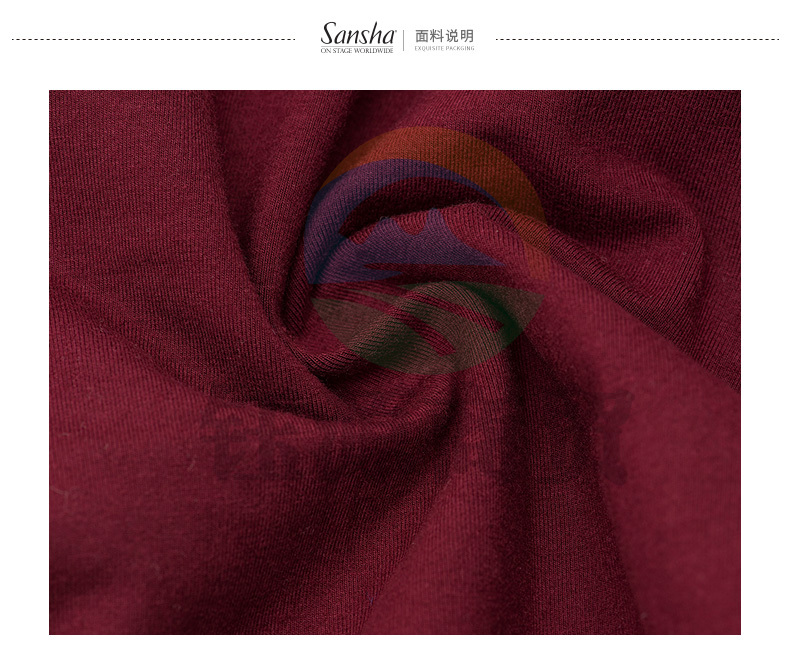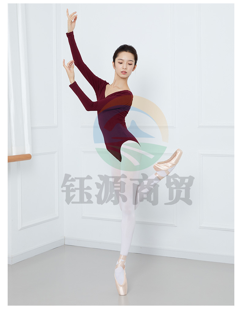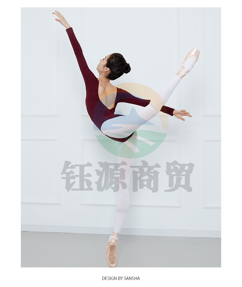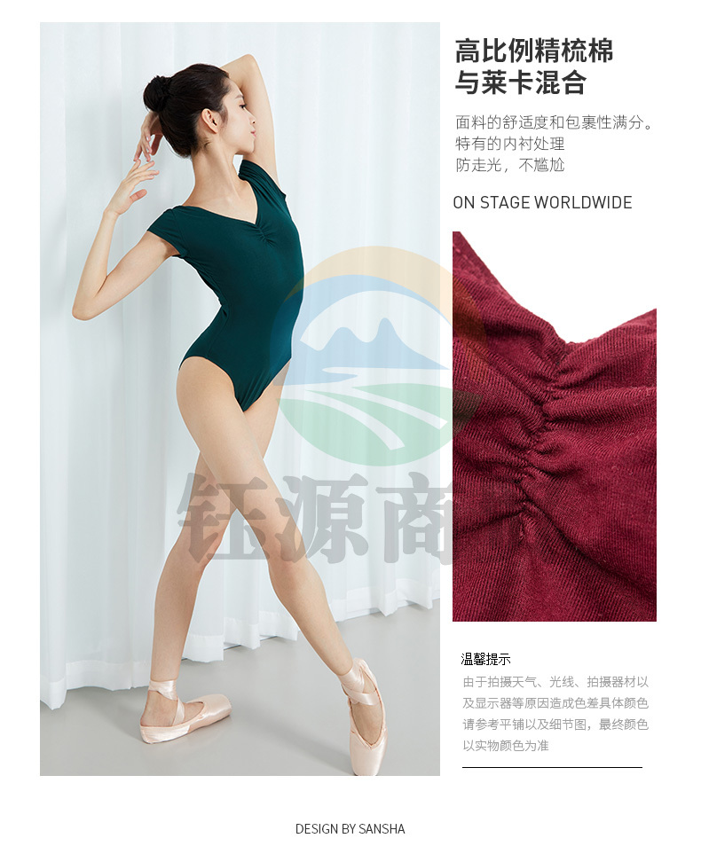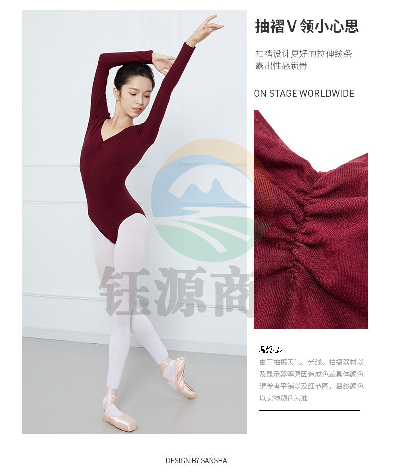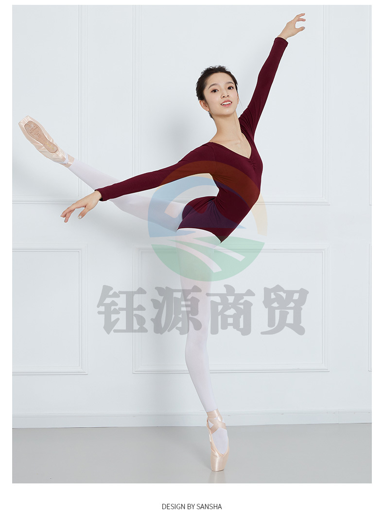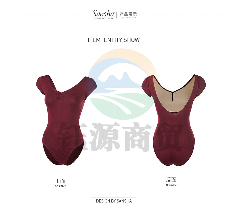 Sansha三沙成人V领舞蹈练功连体服短袖露背芭蕾舞形体操服LS3551枣红XL